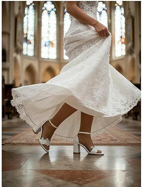 Sandálias de noiva com pérolas brancas, salto bloco, tira no tornozelo e laço, ideais para casamentos na igreja, no jardim e ocasiões formais.