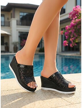Sandálias anabela pretas elegantes com lantejoulas e tule - sandálias confortáveis com plataforma vazada, perfeitas para usar à beira da piscina de hotéis de luxo ou em resorts à noite. &férias