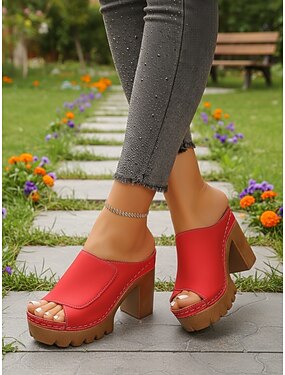 Sandálias mule femininas vermelhas com plataforma e salto bloco – sandálias de bico aberto com sola grossa, perfeitas para o verão, viagens e festas no jardim.