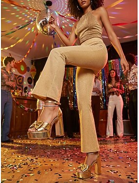 Sandálias femininas de plataforma douradas estilo discoteca dos anos 70 - sandálias de salto alto grosso com glitter brilhante e detalhe de laço, perfeitas para festas no Studio 54 e eventos em
