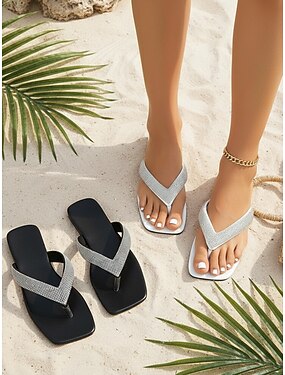 Sandálias femininas brancas elegantes com tira em T - chinelos confortáveis com detalhes brilhantes de cristais, perfeitas para férias em ilhas e resorts de praia. &look boho chic de verão