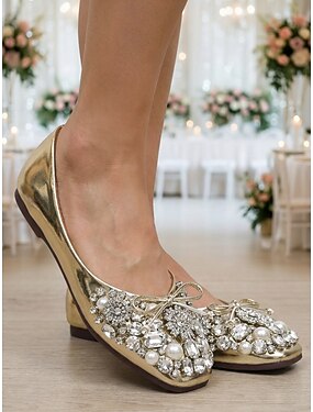 Sapatos de salto baixo femininos com detalhes em cristais dourados, elegantes sapatos para a mãe da noiva em casamentos modernos na cidade.