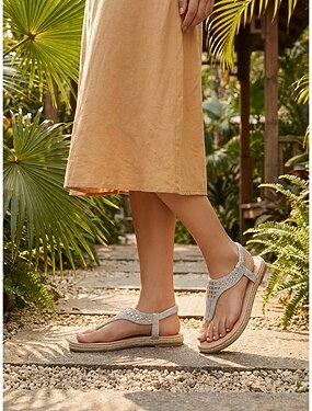 Sandálias femininas brancas elegantes com tira em T - chinelos confortáveis com detalhes brilhantes de cristais, perfeitas para férias em ilhas e resorts de praia. &look boho chic de verão