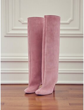Botas femininas de camurça até o joelho - botas longas de bico fino e salto agulha para moda urbana feminina e looks chiques de streetwear