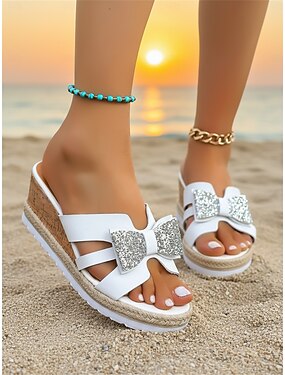 Chinelo feminino de bolinhas com laço – sandálias casuais de praia com sola plataforma confortável para férias, verão e momentos relaxantes à beira da piscina.