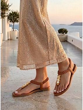 Sandálias rasteiras femininas marrons trançadas com detalhes dourados – ideais para férias. &sapatos de noite de resort