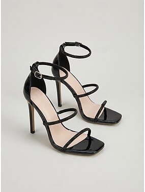Sandálias femininas pretas de salto agulha com tiras, modelo aberto no tornozelo, elegantes e perfeitas para coquetéis e eventos noturnos. &ocasiões formais