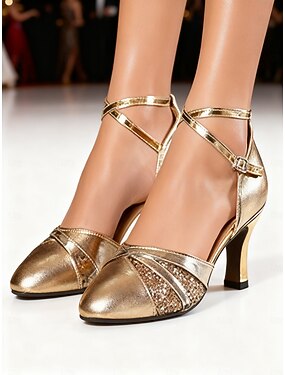 Sapatos de dança latina femininos dourados com tiras cruzadas no tornozelo - saltos brilhantes com glitter para salsa, tango e prática de apresentações.