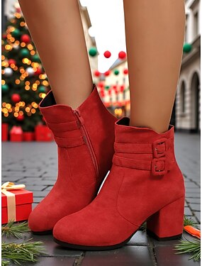 Botas femininas vermelhas de salto alto com zíper, design elegante de salto grosso, perfeitas para festas de Natal, eventos de feriados e uso diário