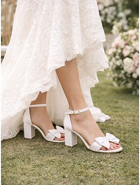 Sandálias de noiva femininas em cetim branco com laço grande – sapatos de casamento com salto bloco para noivas, ideais para casamentos ao ar livre e na praia.