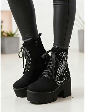 Botas de combate femininas plataforma pretas com bordado de teia de aranha - botas de cano curto góticas com cadarço e salto grosso para festa de Halloween, cosplay e saídas à noite