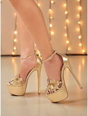Sapatos de salto alto plataforma dourados femininos com aplicações florais - sapatos de festa glamourosos para a noite e eventos especiais.