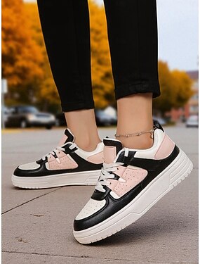 Tênis femininos com cadarço e blocos de cores rosa e preto - calçados confortáveis de caminhada com plataforma de couro sintético para looks casuais, estilo de rua e viagens de outono