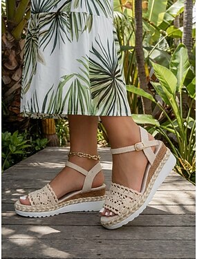 sandálias femininas de cunha em crochê bege – plataforma de alpargatas estilo boêmio com tira no tornozelo para férias de verão, caminhadas na praia e passeios casuais