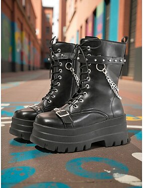 Botas de combate femininas pretas com plataforma – botas grossas de cano curto com cadarço e detalhe de corrente para streetwear punk, shows e festivais