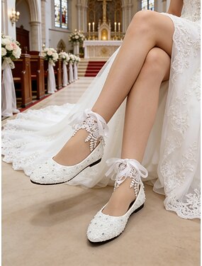 Sapatilhas femininas brancas de renda com fita, sapatos de noiva elegantes com aplicações de pérolas para casamentos na igreja.