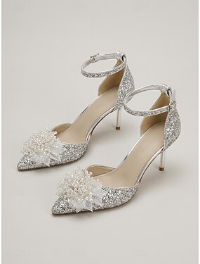 Sapatos de noiva prateados femininos com salto alto – elegantes sapatos de noiva de bico fino com tira no tornozelo para casamentos ao ar livre.