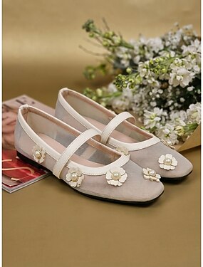 Sapatilhas de ballet femininas elegantes em malha cor damasco - sapatos Mary Jane respiráveis com apliques de flores de pérola, ideais para férias em cruzeiros e momentos de lazer em iates de luxo.
