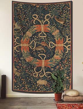 Tapeçaria Medieval Tapeçaria da Idade Média Arte Gótica Grande Tapeçaria Mural Fundo Casa Quarto Sala de Estar Coroa em um Solo de Flores Pássaros e Coelhos