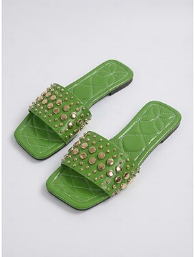 Sandálias femininas verdes com tachas – sandálias casuais de praia, rasteiras e de bico aberto, perfeitas para as férias de verão.
