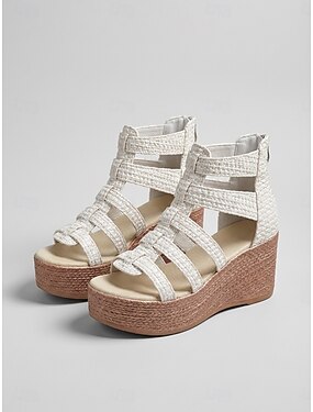 Sandálias gladiadoras brancas femininas com salto romano – design com tiras em formato de gaiola, tira no tornozelo com zíper na parte de trás, calçado casual de verão para férias, praia e viagens.