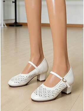 Sapatos de dança Mary Jane femininos, cor marfim, com perfurações, salto baixo e tira com fivela, ideais para bailes de salão profissionais. &eventos de dança
