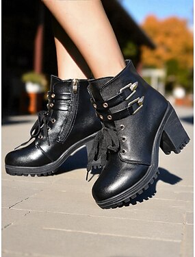Botas femininas marrons de salto grosso com cadarço – estilo combate em couro sintético com zíper lateral e fivela, ideais para roupas de outono, atividades ao ar livre e streetwear casual
