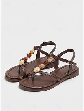 Sandálias femininas marrons estilo boho com tiras e aplicações de pedras artificiais - calçados de praia confortáveis e rasteiros com tira no tornozelo, ideais para férias de verão e viagens para