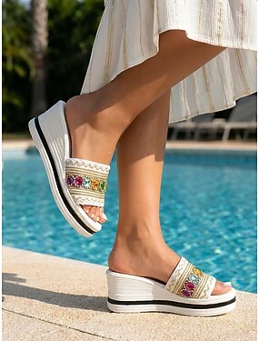 Sandálias plataforma brancas femininas estilo boêmio - mules espadrille coloridas com aplicações de miçangas e pedras preciosas, perfeitas para férias na piscina e festas de verão na praia. &roupas de