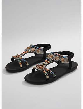 Sandálias rasteiras femininas pretas estilo boêmio com aplicações de miçangas multicoloridas – calçado étnico floral com tira em T, ideal para férias em destinos tropicais e viagens à praia.