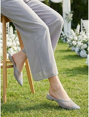 Sapatilhas mule femininas bege em tela, elegantes sapatos de bico fino, ideais para a mãe da noiva e para casamentos no jardim. &eventos formais diurnos
