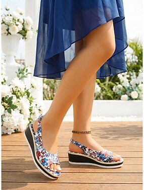 Sandálias femininas de plataforma com estampa floral, confortáveis e com tira no calcanhar, ideais para convidadas de casamentos no jardim, um modelo casual e elegante para usar ao ar livre no verão.