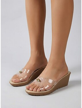 Sandálias femininas elegantes com salto anabela transparente e detalhes em metal dourado, perfeitas para férias em ilhas paradisíacas e cruzeiros tropicais. &resorts de praia de luxo