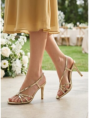 Sandálias femininas douradas de salto alto com tiras – sandálias elegantes de bico aberto e salto agulha para convidadas de casamento no jardim &festas de verão