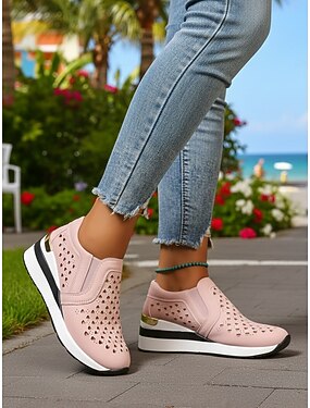 Tênis femininos plataforma rosa – calçados respiráveis para caminhada com recorte e salto dourado para viagens, trabalho e passeios de verão