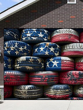 Cobertura para porta de garagem externa comemorativa do 250º aniversário dos EUA, com banner patriótico e bandeira americana ao fundo. Decoração para o feriado do 4 de julho, Dia da Independência. 2,13 x 4,88 m (7 x 16 pés).