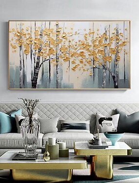 Pintura a óleo sobre tela, com textura abstrata pintada à mão, representando uma paisagem de árvores em estilo moderno. Ideal para decoração de interiores, esta pintura é enviada enrolada, sem moldura
