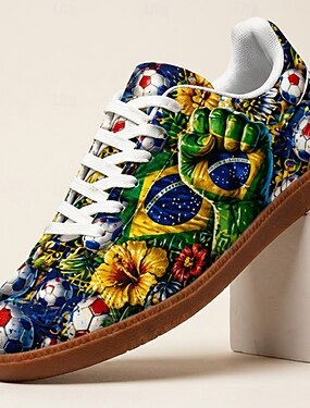 Tênis casuais masculinos com estampa da bandeira do Brasil, modelo de futebol, com cadarço, leves e confortáveis para caminhada, ideais para torcedores, torcer no estádio, participar de eventos esportivos, viajar e usar no dia a dia.