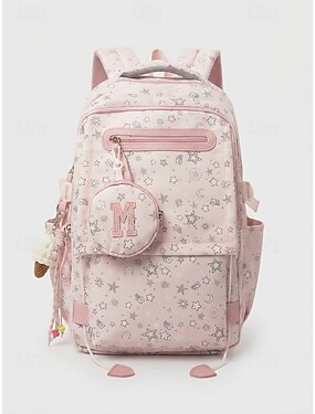 Mochila feminina de poliéster com estampa de estrelas multicoloridas, grande capacidade, alças ajustáveis, ideal para volta às aulas, viagens, esportes ao ar livre e uso casual no dia a dia.