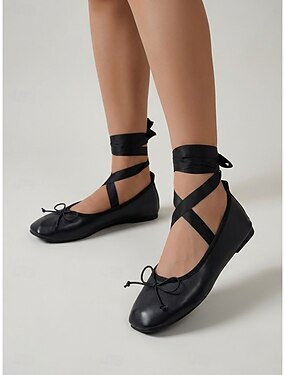 Sapatilhas pretas femininas com laço no tornozelo - elegantes sapatilhas de bailarina com bico redondo e detalhe de laço, ideais para o dia a dia no trabalho, passeios na cidade e looks casuais clássicos.