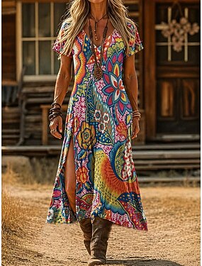 Mulheres Vestido Longo Vestidos Para o Verão Vestido T shirt Vestido A Line Férias Casual Praia Para Noite Ajuste Largo Floral Gráfico Tribal Manga Curta Decote V Vermelho Roxo Laranja Verão Primavera