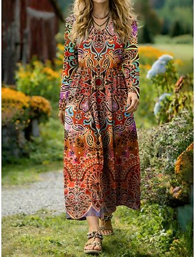 Mulheres Vestido Longo Vestido de turno Vestido A Line Festa Casual Boho Diário Encontro Para Noite Normal Tintura Tie Dye Tribal Manga Longa Gola Redonda Vermelho Azul Roxo Verde Primavera Outono