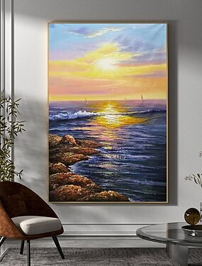 Pintura a óleo artesanal em tela, arte de parede, decoração original, paisagem marítima, pôr do sol para decoração de casa com moldura esticada, sem pintura de moldura interna