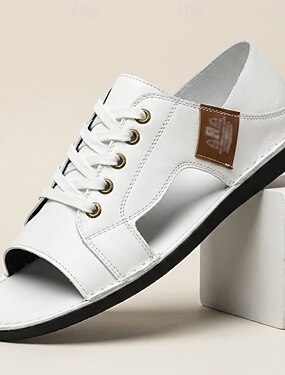 Sandálias masculinas brancas de amarrar, modelo casual de verão com bico aberto, leves e confortáveis, ideais para resorts, viagens à praia, passeios em ilhas e cruzeiros, caminhadas de férias e momentos de lazer em destinos tropicais.