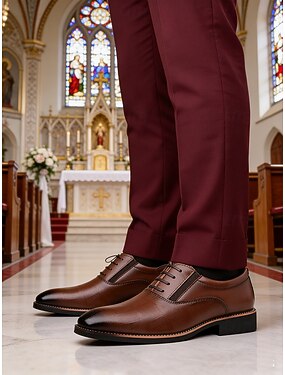 Sapatos sociais masculinos Oxford em couro sintético marrom, design clássico com cadarço, acabamento polido, estilo formal elegante para noivos e convidados de casamento.
