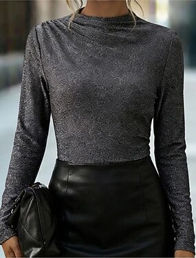 Mulheres Pequeno T-shirt Pregas Acabamento brilhante Côr Sólida Elegante à moda Manga Longa Pescoço Tops regulares Diário Trajes de festa Preto e cinza Primavera Outono