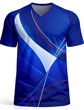 Camisa de futebol masculina azul, branca e vermelha com estampa abstrata degradê, inspirada no estilo francês, respirável e com proteção UFP50+.