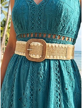 Cinto feminino boho trançado e elástico, em palha com fivela de madeira, disponível em preto e branco, perfeito para férias, viagens e uso casual no dia a dia.