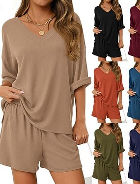 Mulheres Conjuntos de shorts Manga 3/4 Decote V Côr Sólida Moda Roupa de rua Casual Diário Ao ar livre Azul Preto Vinho Verão Normal