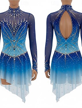 Vestidos para Patinação Artística Mulheres Patinação no Gelo Vestidos Azul Patchwork Sem costas Elasticidade Alta Treino Competição Roupa para Patinação Clássico Cristal / Strass Manga Longa